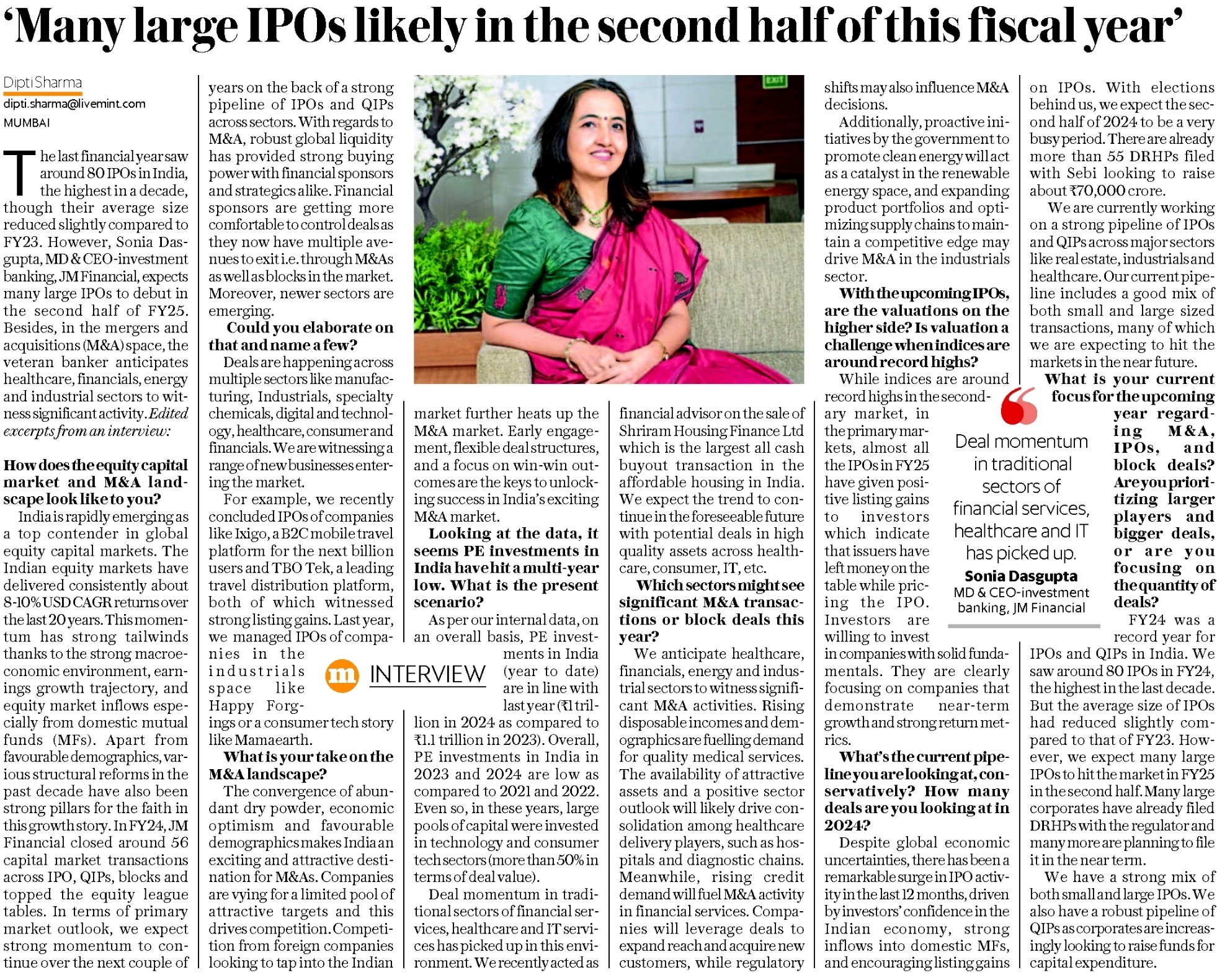 Sonia Dasgupta – “Expect many large IPOs to hit the market in H2 of FY25”